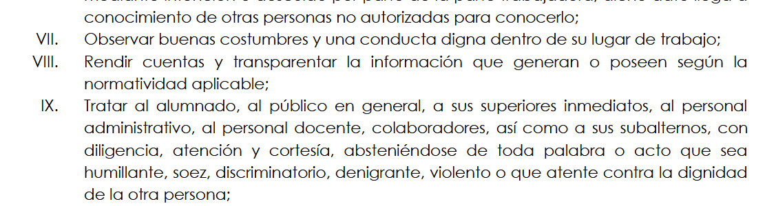 Pero la parte más trágica es que la universidad protege acosadores. Según el reglamento de la universidad, el comportamiento del personal debería ser así
